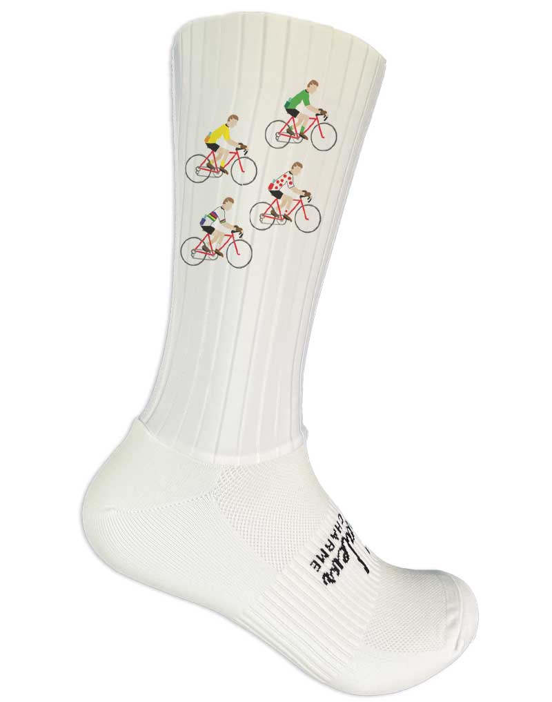 Zie er top uit met deze wielersokken met klassieke ‘pedaleurs’! De gele trui, de groene trui, de bolletjestrui en natuurlijk de wereldkampioen zijn vertegenwoordigd.